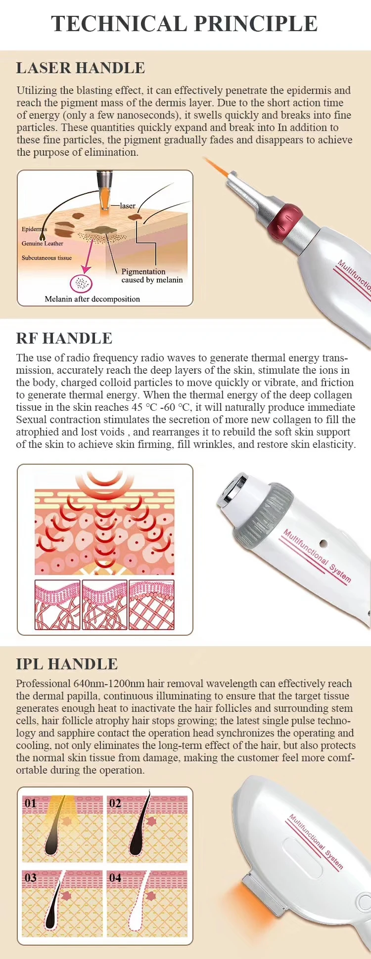 Unveil flawless beauty with the 3-in-1 IPL+RF+YAg Hair Removal machine. Seamlessly integrating IPL, RF, and Q-switched Nd:YAG laser technologies, this device delivers effective hair removal, skin rejuvenation, and tattoo removal treatments. Harnessing the power of light and radiofrequency energy, it targets hair follicles, stimulates collagen production, and removes tattoos