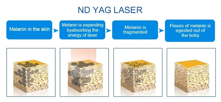 Adopting the Q-Switched ND:YAG model,the equipment uses laser to emit high energy instantaneously which smashing the pigment of pathological tissues,namely the laser leading explosive effect:High energy emits instantaneously,making particular wavelength laser penetrating epidermis and getting into pathological pigment tissues in only 6nms.Then pigments expand in top speed and explode.The superficial epidermis would be bounded out of body;other part of the pigments would split into granules which would be engulfed by macrophages,then exclude by the lymphatic system finally.The pigment becomes shallow gradually finally disappear while the surrounding normal skin tissues keep sound as they do not absorb particular wavelength laser.