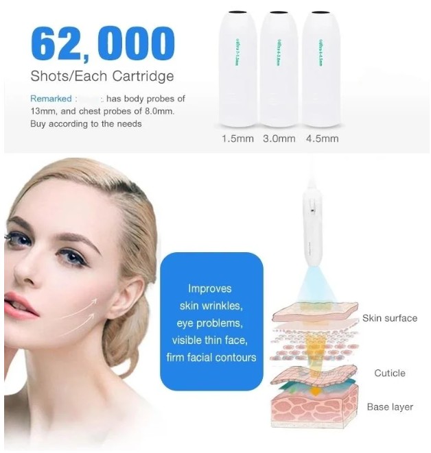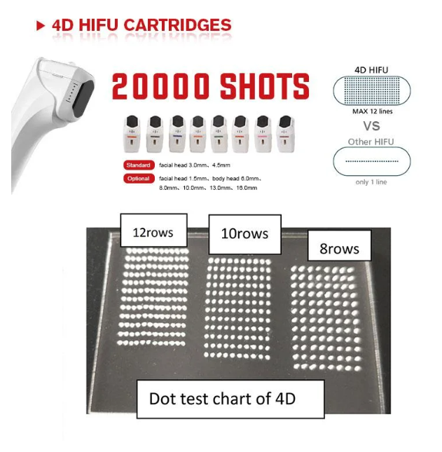 The number of rows is multi-dimensional, the traditional HIFU shot once only can get 1 line, so it will be a little toublesome to do body weight loss. But 4D HIFU can be freely adjusted from 1-12 lines.Treatment of parts and regions are multi-dimensional:facial wrinkles, chest pulling,body weight loss.Adjustable parameters are multidimensional: the distance between points and points, the distance between rows and rows. The energy of each point. The length of each line. These can be adjusted.Treatment is more precise and free.